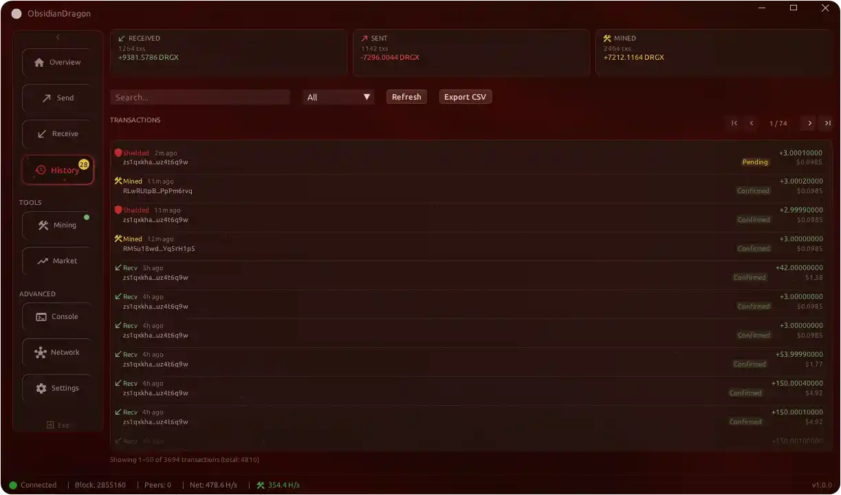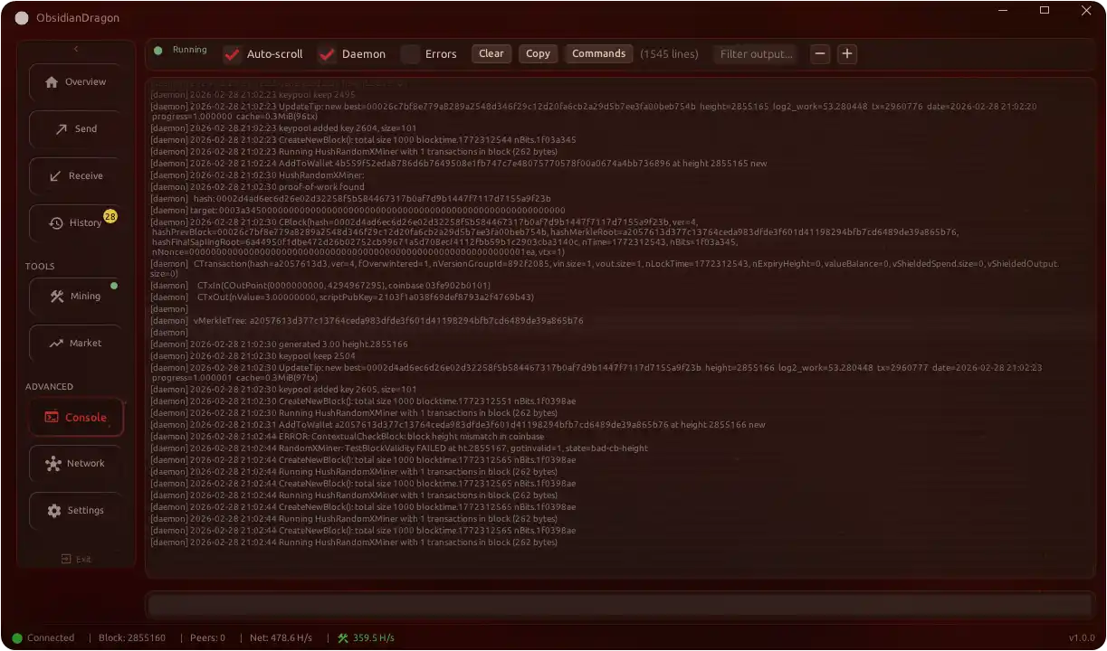 - **Integrated Mining**: CPU mining controls with hashrate monitoring
