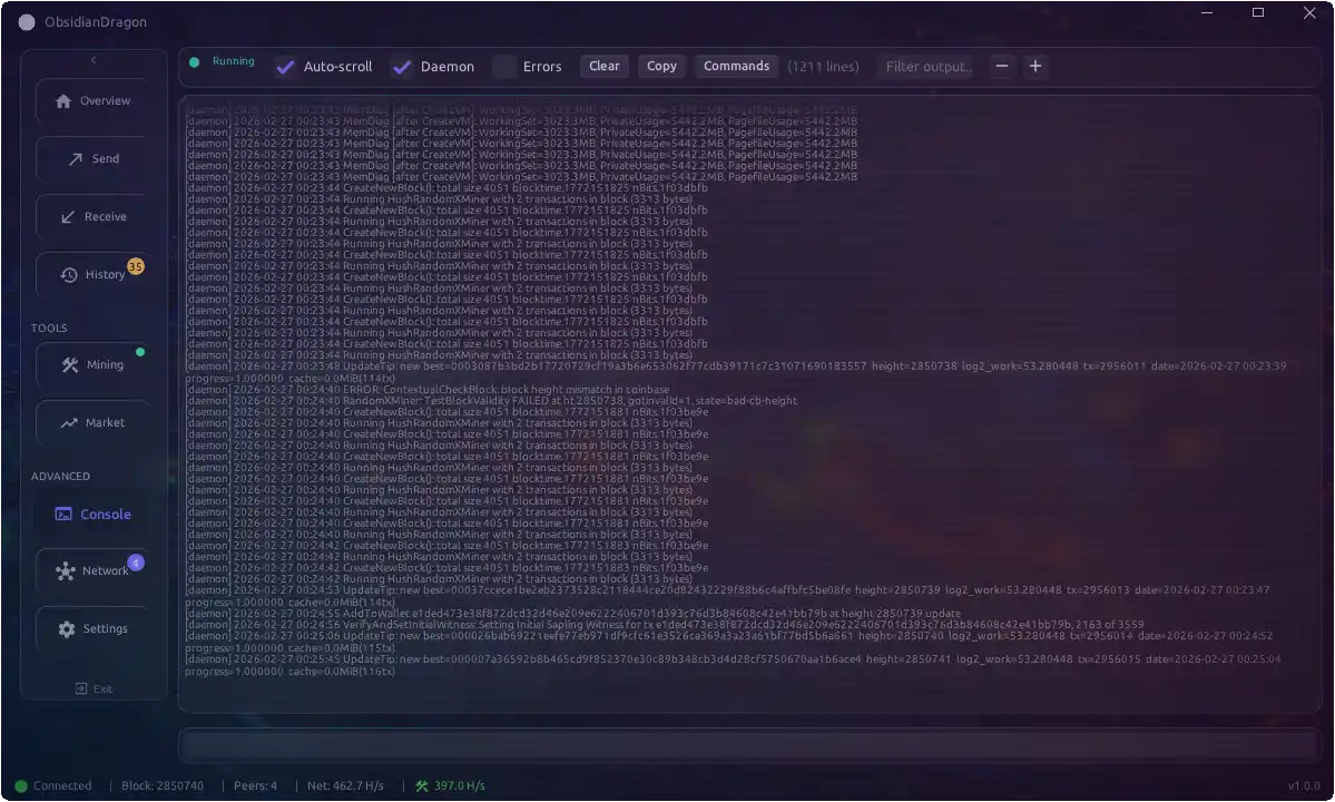 Full-node GUI wallet for DragonX cryptocurrency. Built with Dear ImGui, SDL3, and OpenGL3/DX11. Features: - Send/receive shielded and transparent transactions - Autoshield with merged transaction display - Built-in CPU mining (xmrig) - Peer management and network monitoring - Wallet encryption with PIN lock - QR code generation for receive addresses - Transaction history with pagination - Console for direct RPC commands - Cross-platform (Linux, Windows)