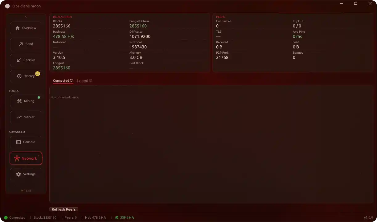 - Integrated Mining: CPU mining controls with hashrate monitoring