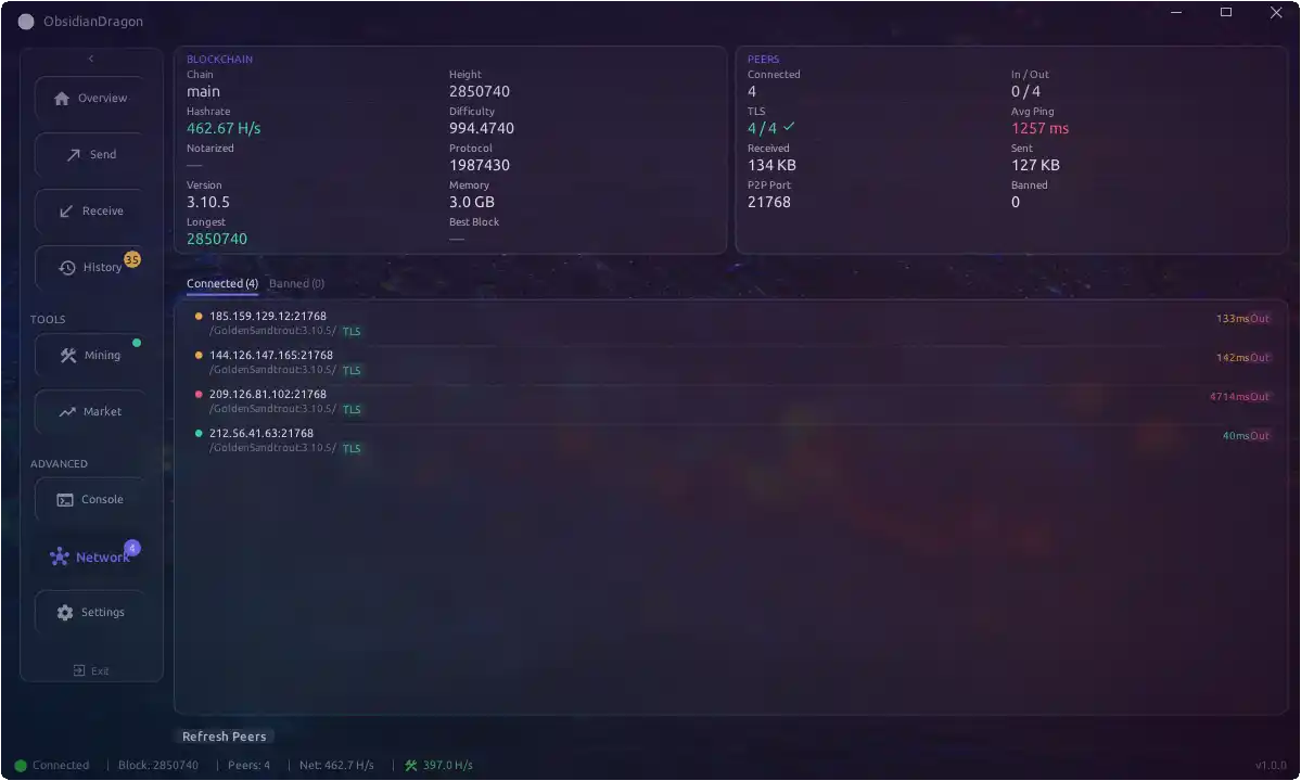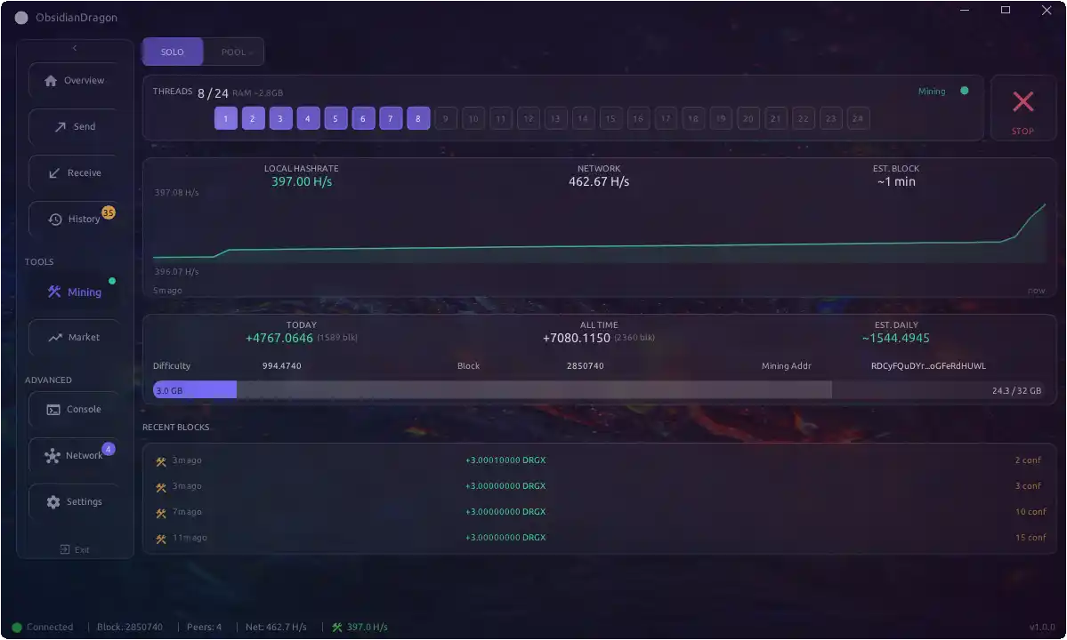- Integrated Mining: CPU mining controls with hashrate monitoring