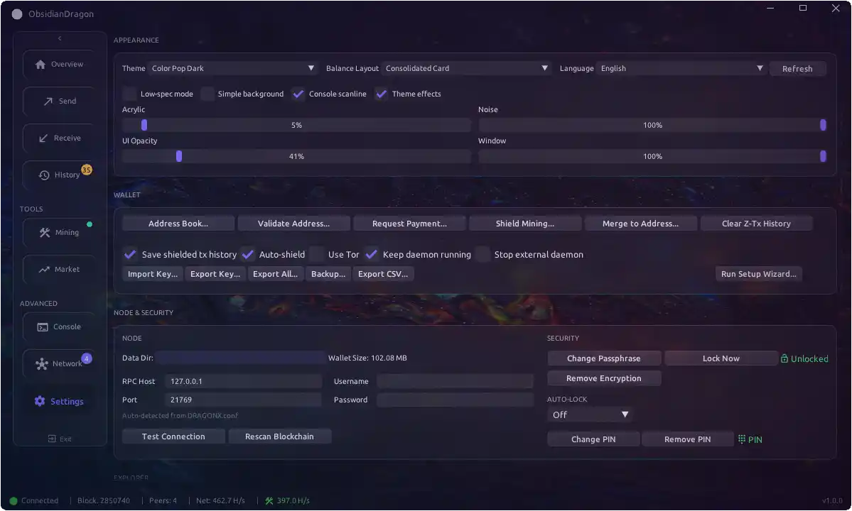 - Integrated Mining: CPU mining controls with hashrate monitoring